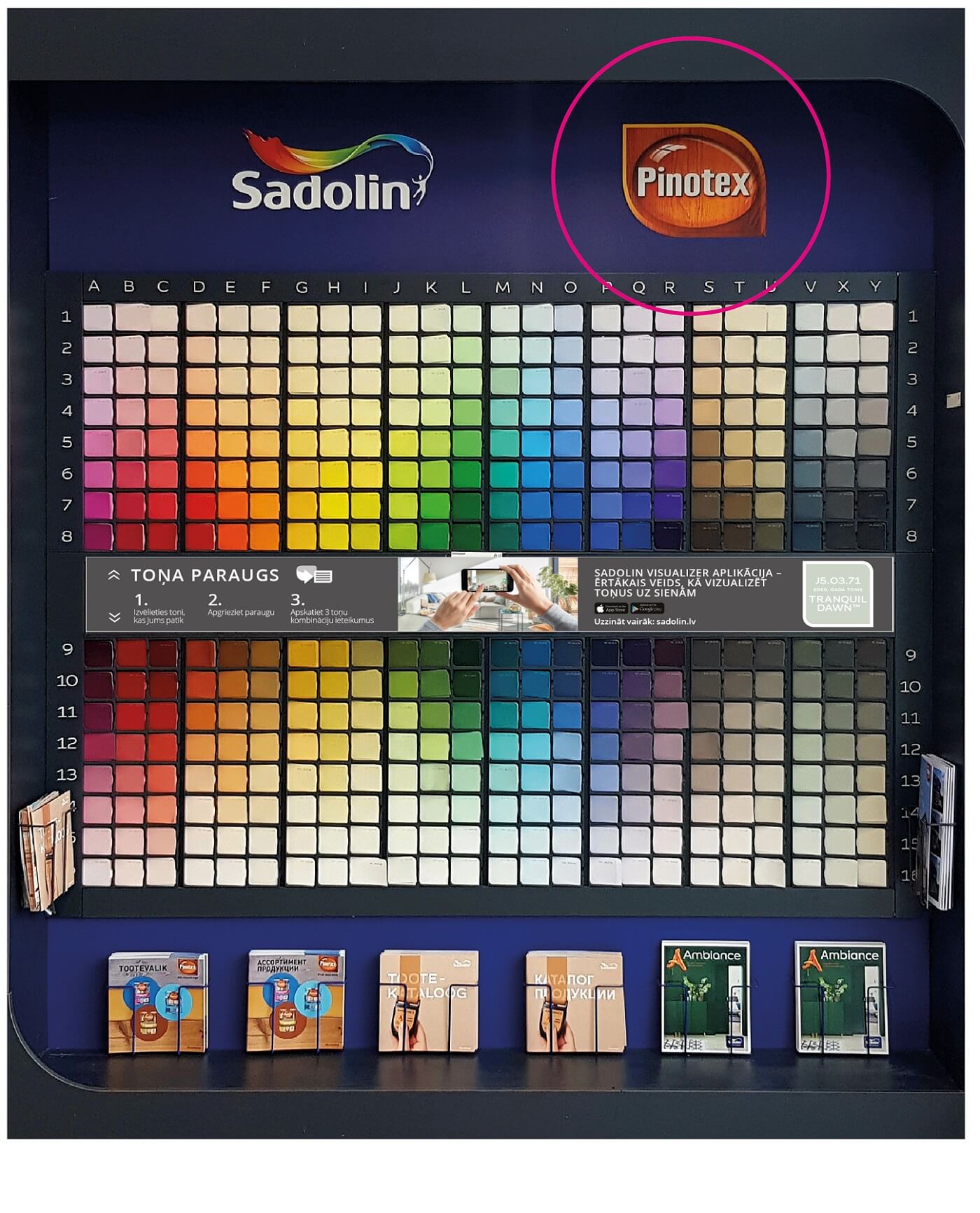 “Pinotex” lazūras koksnes aizsarglīdzekļu "Pinotex Extreme Lasur", "Pinotex Ultra Lasur" un "Pinotex Classic Lasur" toņu gammu atradīsiet būvmateriālu veikalos novietotajos “Pinotex” krāsu stendos – jau kā nokrāsotus toņu paraugus. Tur ir doti gan gatavie, gan tonējamie koksnes aizsarglīdzekļu toņi, kā arī koksnei paredzēto krāsu toņu izvēle. Šo toņu kolekciju atradīsiet arī toņu kartē “Pinotex Colour Collection”, ko var paņemt līdzi, aizejot no veikala, lai mājās mierīgi varētu pārdomāt izvēli. Attiecībā uz lazūras pārklājumu jāatceras, ka veikalā izliktais paraugs var mazliet atšķirties no galarezultāta atkarībā no uzklāto kārtu skaita, izraudzītā produkta spīduma pakāpes, kā arī pamatvirsmas koksnes tekstūras. Tāpat noteikti jāņem vērā atšķirība starp dabisko un mākslīgo apgaismojumu.