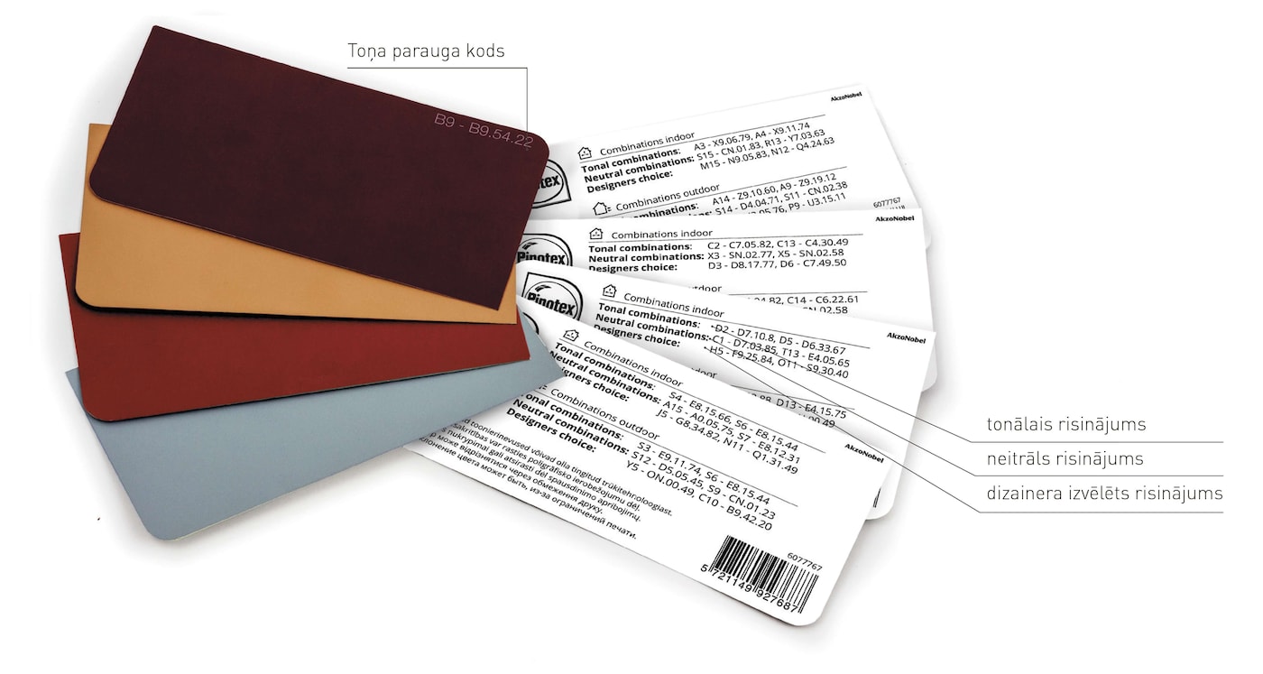 Koksnei paredzētās krāsas “Pinotex Wood Paint Extreme”, “Pinotex Wood Paint Duo VX+” un “Pinotex Wood Paint Aqua” var tonēt plašā toņu gammā. Idejas piemērotam krāsas tonim atradīsiet būvmateriālu veikalos esošajos “Sadolin” un “Pinotex” toņu paraugu stendos. Izvēloties toņus, pievērsiet uzmanību arī toņa parauga otrai pusei, kur ir sniegti padomi par attiecīgā toņa saskaņošanu ar neitrāliem un saskanīgiem toņiem, kā arī dizaineru ieteikumi par to, ar kādiem toņiem attiecīgu toņu ieteicams kombinēt.